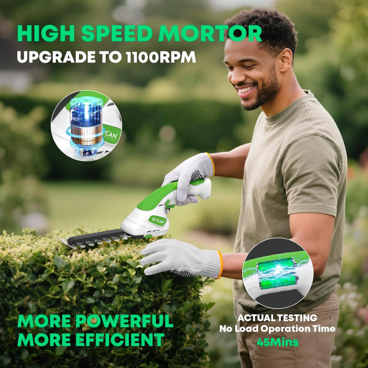 Powerful 1100 RPM Motor & 2-in-1 Versatility: This cordless shrubbery trimmer has been upgraded with a powerful motor that spins at up to 1,100 rpm for smooth hedge trimming (cutting length of 4.72 inches) and precise grass cutting (cutting width of 3.15 inches) that effortlessly handles branches up to 8mm thick. The innovative 2-in-1 design allows it to switch seamlessly between grass cutting and hedge trimming modes, making it the perfect tool for shaping lawns