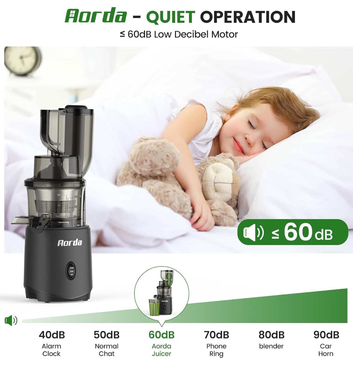 Silent Powerhouse & Juice Peacefully Anytime -- Don't sacrifice tranquility for health. Aorda's slow juicer features a robust 200W motor and advanced anti-clogging technology, delivering maximum juice yield (up to 20% more!) with minimal waste – truly making every drop count. Yet, it operates at a remarkably quiet 65dB – quieter than a normal conversation. Enjoy crafting fresh, nutrient-packed juices at dawn or midnight without waking a soul. Efficiency meets serenity
