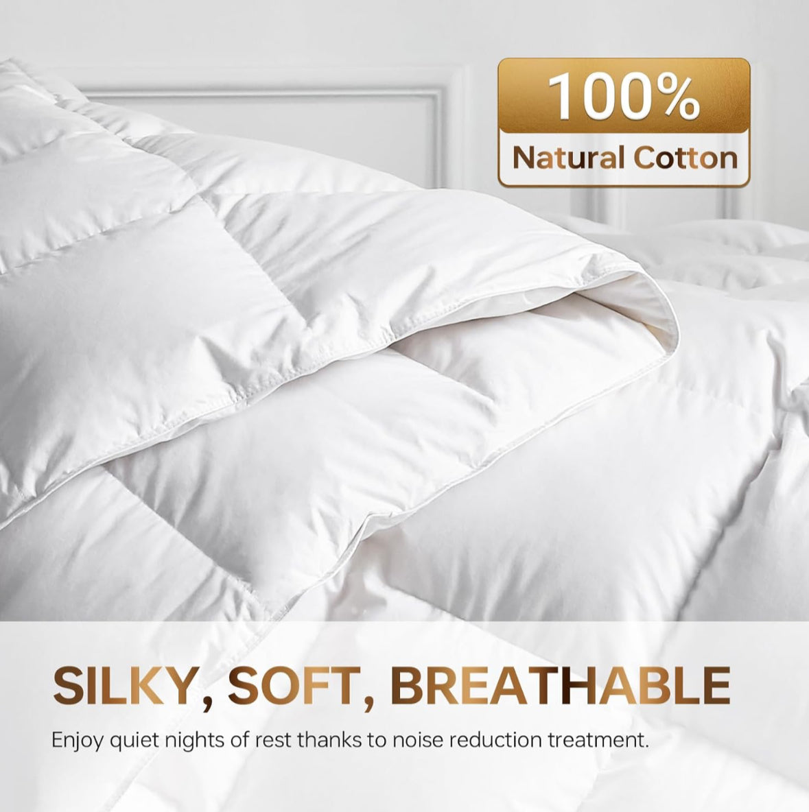 - 3. The down comforter's shell is made of 100% high-thread-count cotton, certified by OEKO-Tex Standard 100—this premium cotton makes the goose down comforter softer, more breathable, and cloud-like comfortable for cold seasons. You can enjoy this comfort in cold weather, spring, fall or winter.